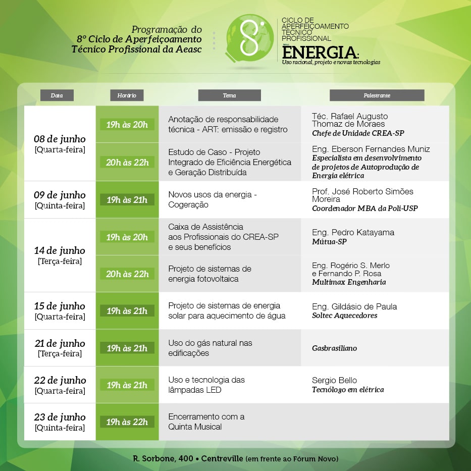 Começa na próxima semana mais uma edição do Ciclo de Aperfeiçoamento Técnico Profissional da AEASC. Confira abaixo a programação completa do evento: Programação